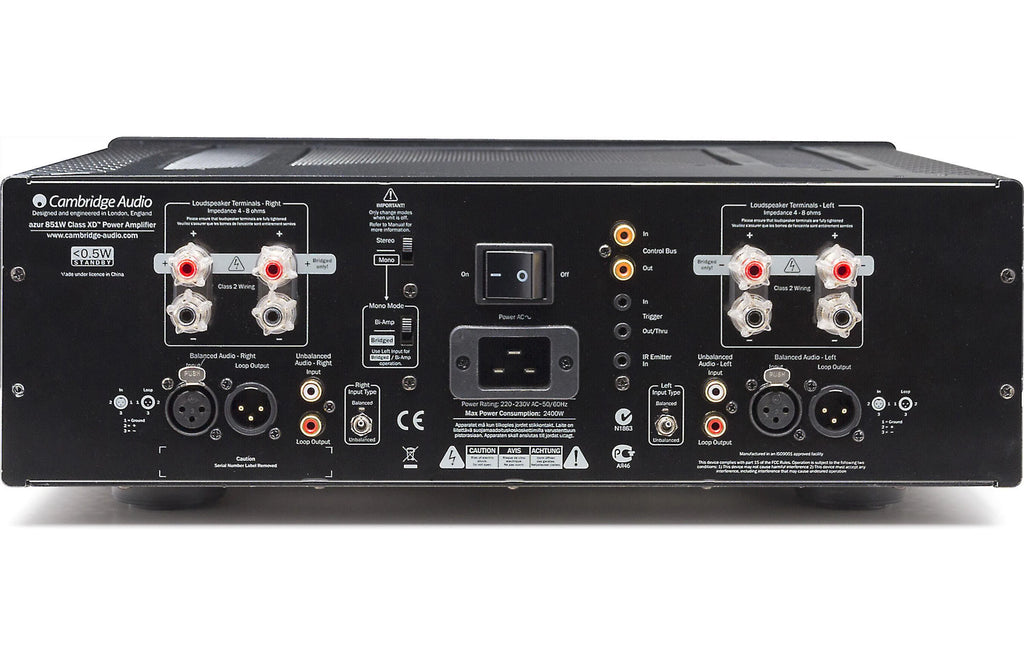- selectable stereo (single- or bi-wired), bi-amp (mono) and bridged mono modes