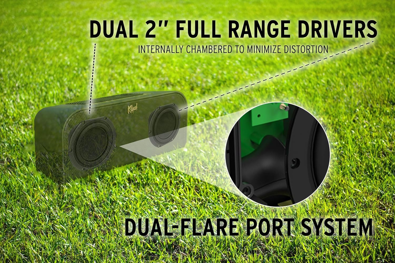 While it’s small in stature, it powers the remarkably large sound Klipsch is known for. Dual 2.5” (6.35cm) full range drivers are enhanced with dual 3” (7.62cm) passive radiators for deep, musical bass. 40 watts of peak system power with advanced DSP equalization provides lifelike, dynamic sound at any volume level.