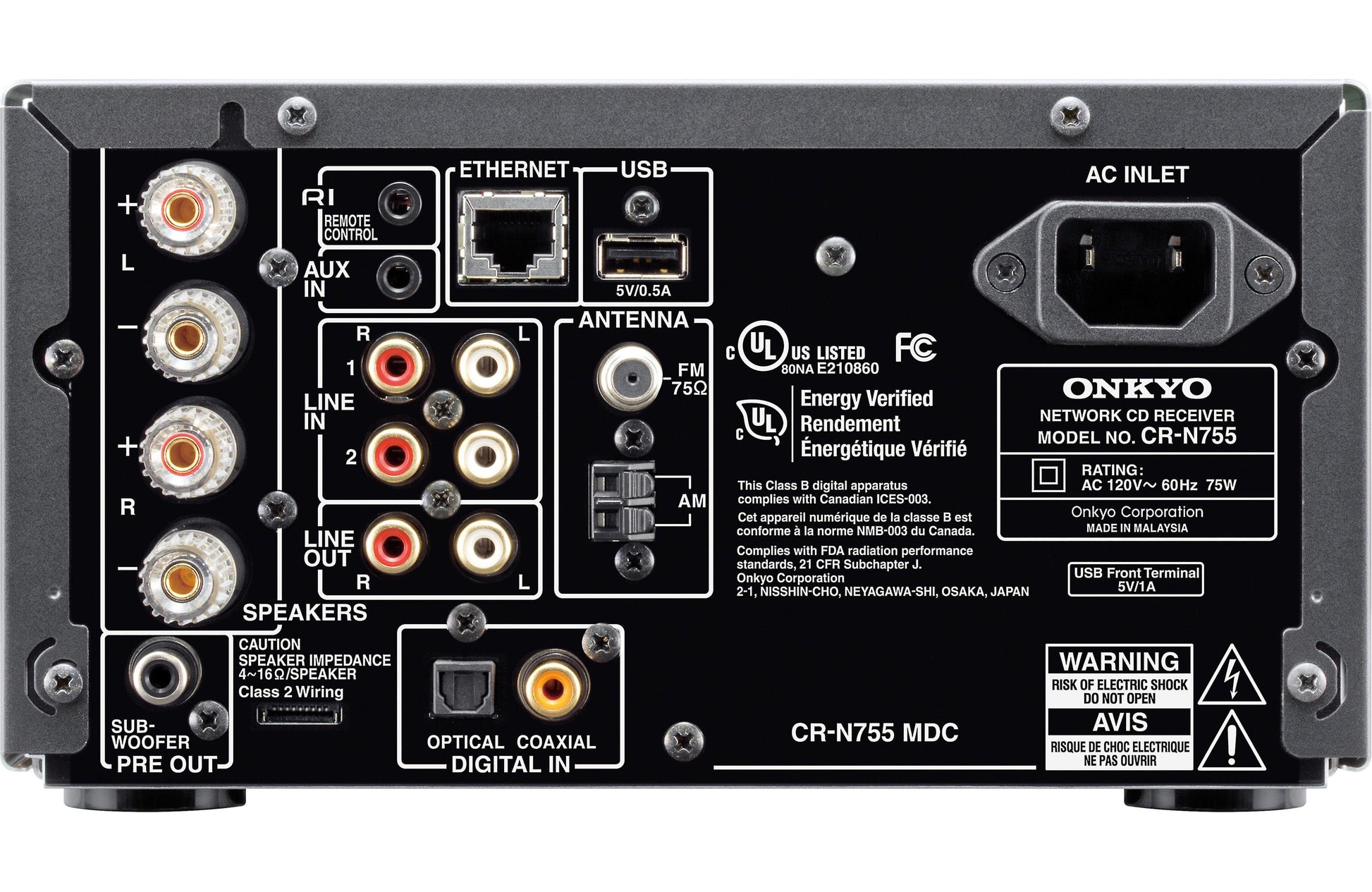 As well as a pre-out for a powered subwoofer -- freeing the speakers to more efficiently handle mid and high frequencies -- the CS-N755 has 96 kHz / 24-bit optical and coaxial inputs. If your PC has a digital line out, you can direct audio through the Onkyo system, with signals carried straight to the receiver's 192 kHz / 24-bit DAC. You can experience everything from iTunes music to YouTube videos with power and precision. Plus, besides the front-panel USB port, there is a selection of rear-side analog inputs to connect everything from your cell phone to a turntable